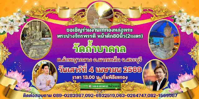 ขอเชิญร่วมงานเททองหล่อพระประธาน(ปางจักรพรรดิ) หน้าตัก 2 เมตร ณ วัดถ้ำบาดาล สระบุรี ในวันเสาร์ที่ 4 เมษายน 2569 เวลา 13:00 น. เริ่มพิธีเททอง ประธาน ฝ่ายฆราวาส อาจารย์ซัน มหาทศดารา เจ้าพิธี คุณสมบูรณ์ ศุขีวิริยะ คุณอมฤทธิ์ กล่อมจิตเจริญ